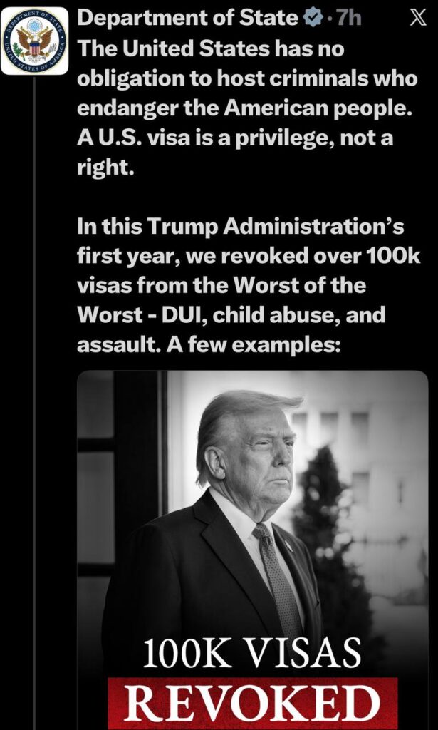 بر اساس این گزارش، در نخستین سال دولت دونالد ترامپ بیش از ۱۰۰ هزار ویزا از افرادی که دارای سوابق کیفری جدی بودهاند لغو شده است. این موارد شامل جرائمی مانند رانندگی تحت تأثیر الکل (DUI)، کودکآزاری و حمله و خشونت فیزیکی بوده که مقامات آمریکایی از آنها با عنوان «بدترین مجرمان» یاد کردهاند.
